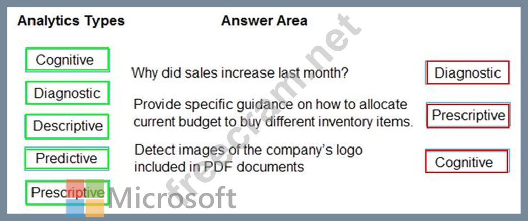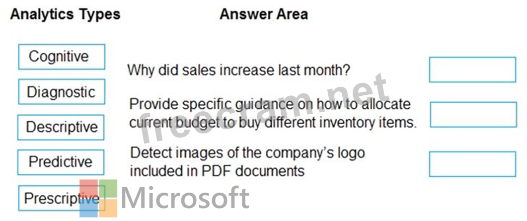 To answer, drag the appropriate analytics type from the column on the left to its question on the right. Each analytics type may be used once, more than once, or not at all.