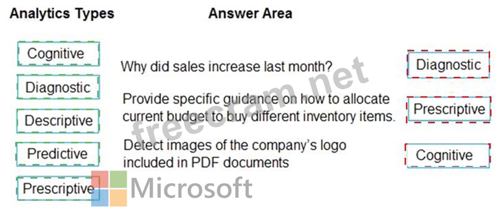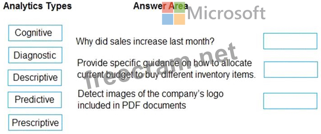 To answer, drag the appropriate analytics type from the column on the left to its question on the right. Each analytics type may be used once, more than once, or not at all.