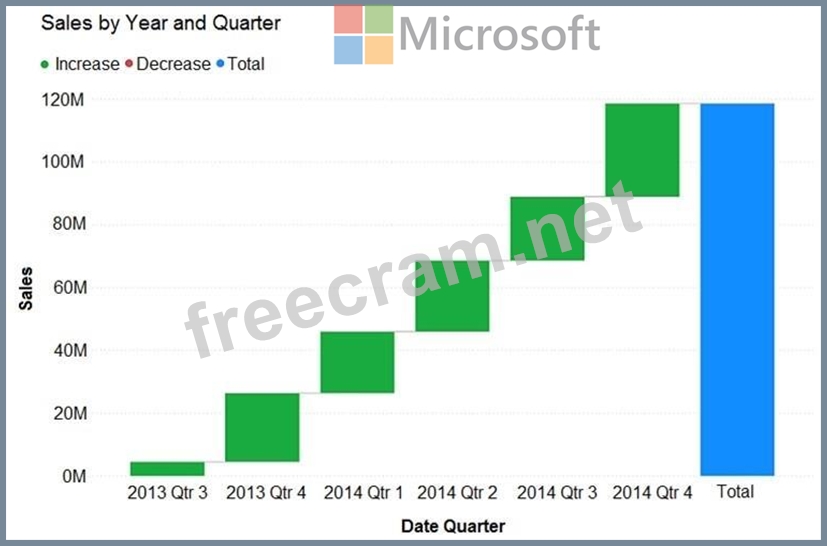 You need to create a visualization of running sales totals per quarter as shown in the following exhibit.