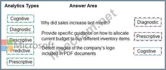 To answer, drag the appropriate analytics type from the column on the left to its question on the right. Each analytics type may be used once, more than once, or not at all.