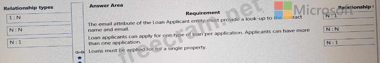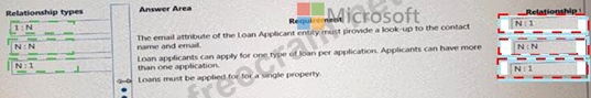 Which relationship types should you use? To answer, drag and drop the appropriate relationship types to the correct requirements. Each relationship type may be used once, more than once, or not at all. You may need to drag the split bar between panes or scroll to view content.