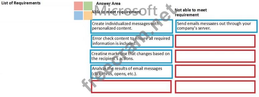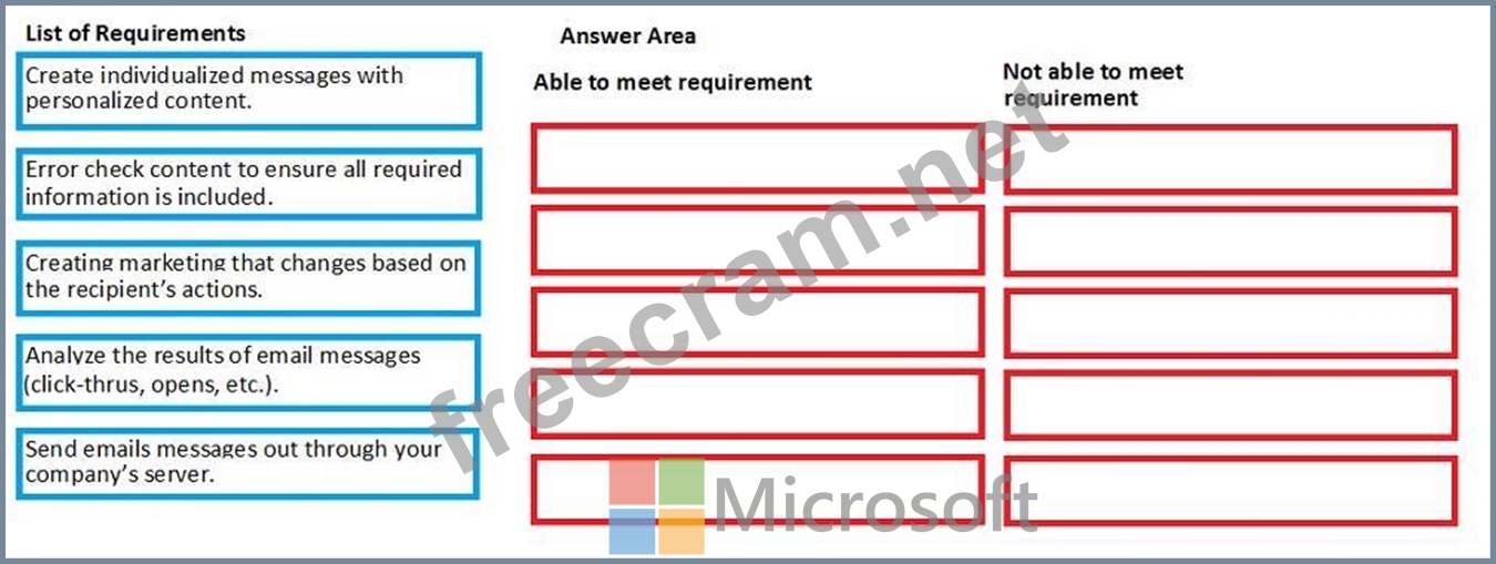 Drag and Drop Question Your marketing department has given you a list of requirements. Which requirements will you be able to meet by utilizing the tools in Dynamics 365 for Marketing? To answer, drag the appropriate requirement to the correct column. Each requirement may be used once, more than once or not at all. You may need to drag the split bar between panes or scroll to view the content. NOTE: Each correct selection is worth one point.