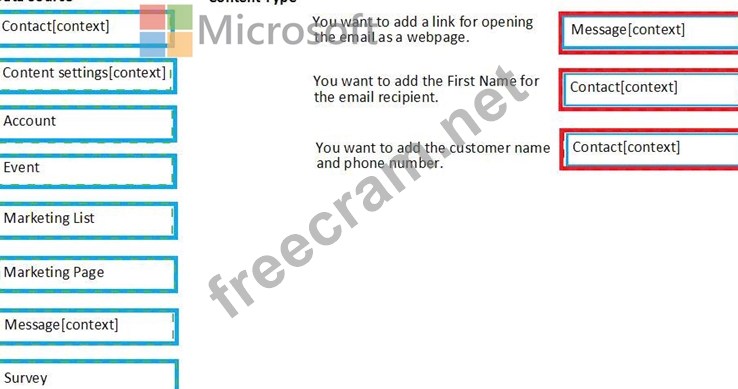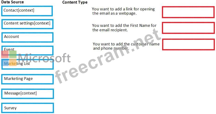 Which data source should you use to add the content types listed? To answer, drag the appropriate data source to the appropriate content type. Each data source may be used once, more than once and not at all. You may need to drag the split bar between panes or scroll to view the content.