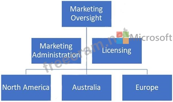ProseWare, Inc. has a total of 10 Dynamics 365 for Marketing licenses for each of the three geographic Business Units, one of which is the Administrator license. All other business units have 5 licenses each.