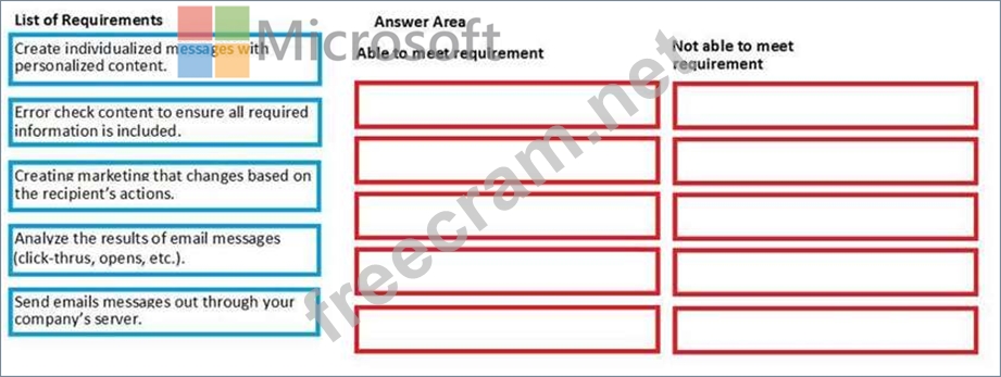 Which requirements will you be able to meet by utilizing the tools in Dynamics 365 for Marketing? To answer, drag the appropriate requirement to the correct column. Each requirement may be used once, more than once or not at all. You may need to drag the split bar between panes or scroll to view the content.