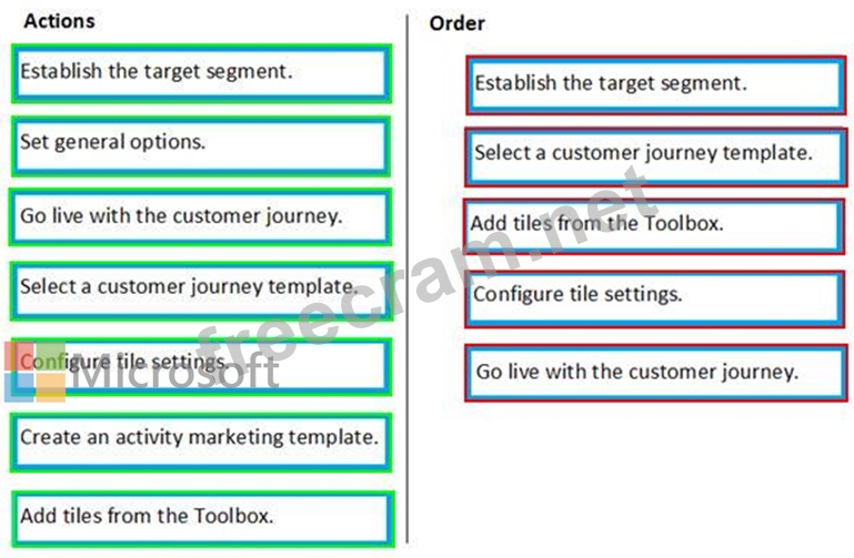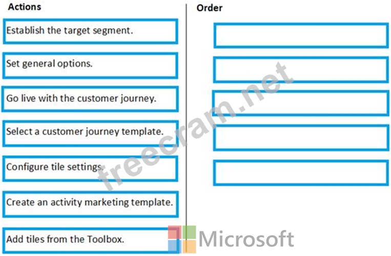 Which five actions are required, in sequence, to create a complete customer journey? (Choose five.) To answer, move the appropriate actions from the list of actions to the answer area and arrange them in the correct order.