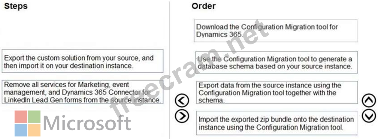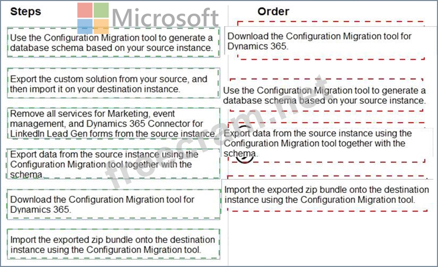 You are a functional consultant at Contoso, Ltd. Your company has a current Dynamics 365 Marketing instance and would like to migrate to a new instance. In order to save time, management has decided to replicate the current instance configuration and data using the Configuration Migration tool for Dynamics 365.