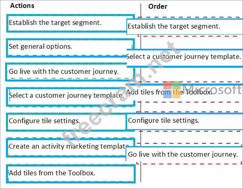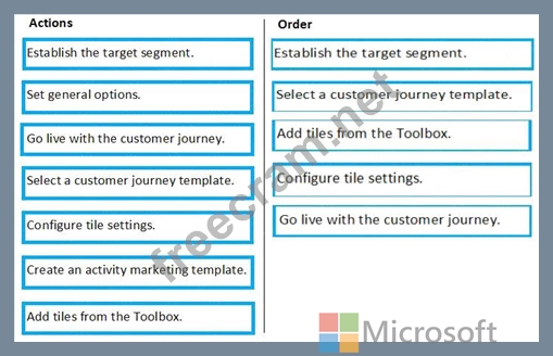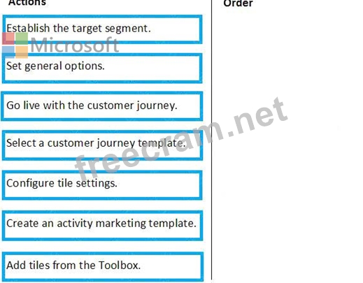 Which five actions are required, in sequence, to create a complete customer journey? To answer, move the appropriate actions from the list of actions to the answer area and arrange them in the correct order.
