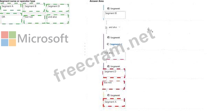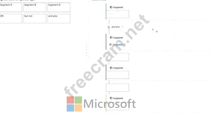 Which segment name or operator type applies in each segment block and query operator' To answer, drag the appropriate segment name or operator type to the correct empty segment blocks and query operators in the answer area. Each segment name will be used once. Each operator type may be used once, more than once, or not at all.