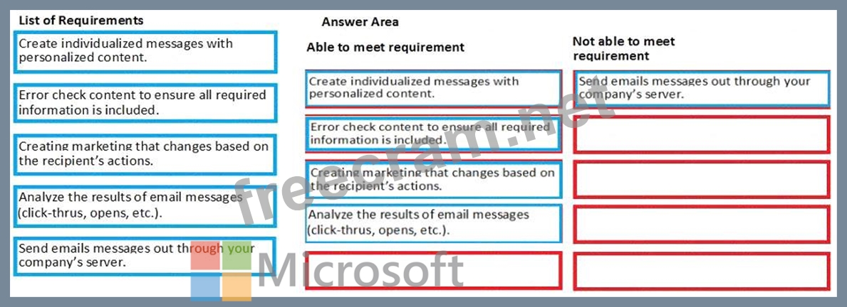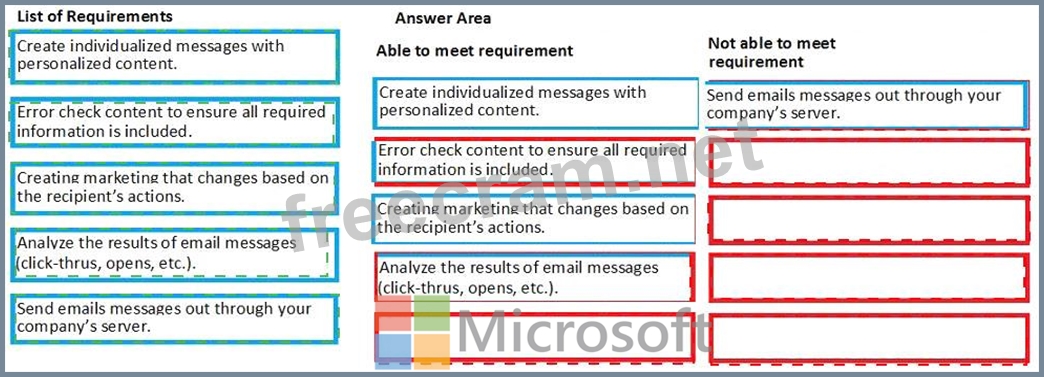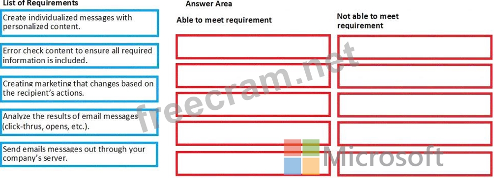 Which requirements will you be able to meet by utilizing the tools in Dynamics 365 for Marketing? To answer, drag the appropriate requirement to the correct column. Each requirement may be used once, more than once or not at all. You may need to drag the split bar between panes or scroll to view the content.