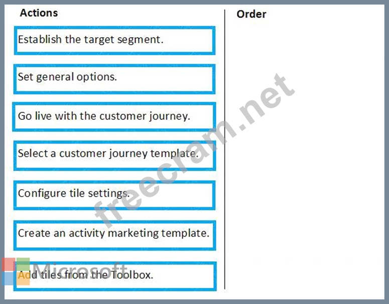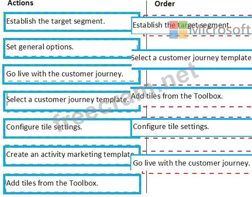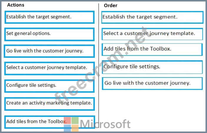 Which five actions are required, in sequence, to create a complete customer journey? To answer, move the appropriate actions from the list of actions to the answer area and arrange them in the correct order.