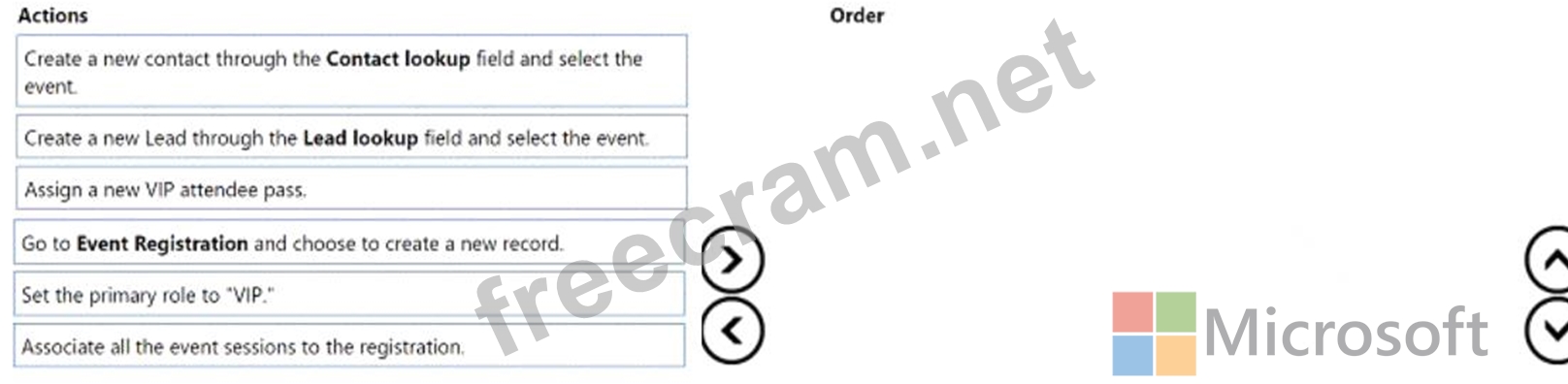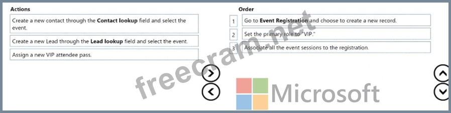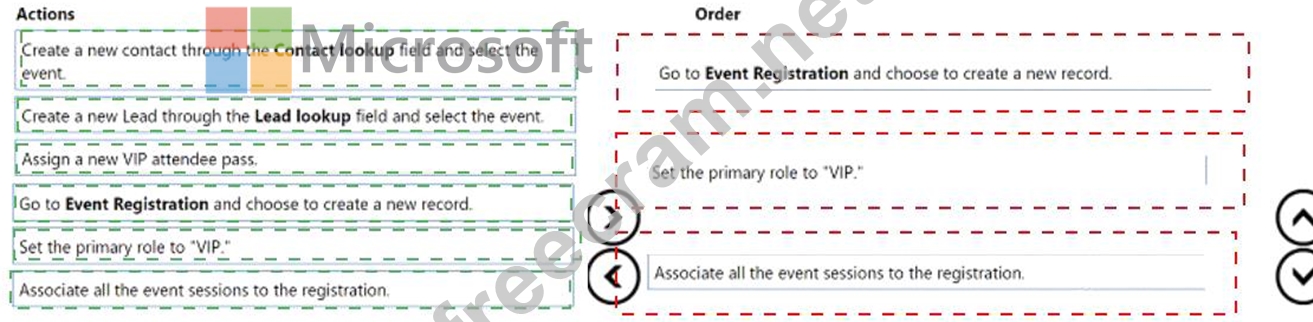 The event coordinator accesses Dynamics 365 Marketing to "promote" the influencer Which three actions should the event coordinator perform in sequence? To answer, move the appropriate actions from the list of actions to the answer area and arrange them in the correct order.
