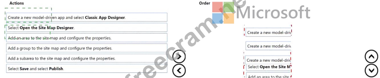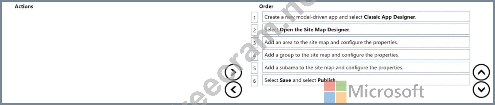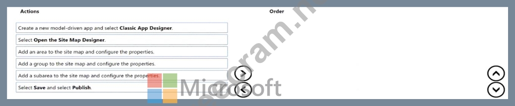In which order should you perform the actions to add the site map into your solution? To answer, move all actions from the list of actions to the answer area, and arrange them in the correct order.
