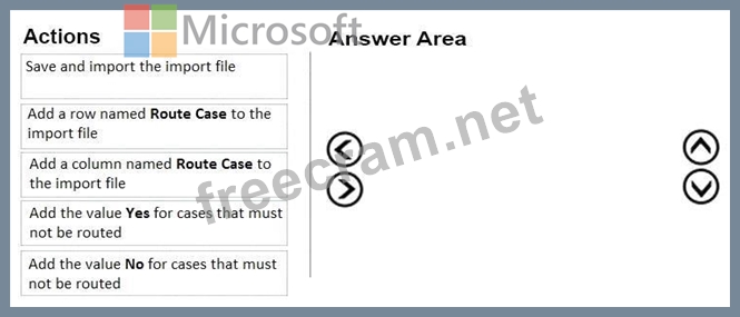 You are a Dynamics 365 for Customer Service administrator. You need to import cases from a file without applying routing rules. Which three actions should you perform in sequence? To answer, move the appropriate actions from the list of actions to the answer area and arrange them in the correct order.