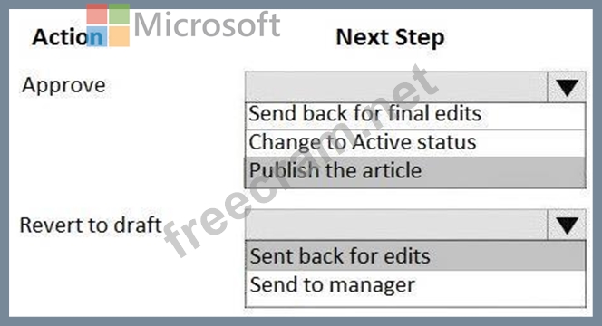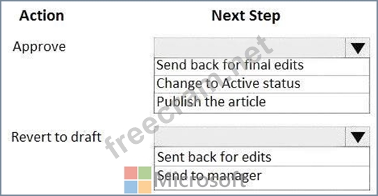 You are a Microsoft Dynamics 365 for Customer Service administrator. You create an article for a knowledge base. A reviewer selects articles for review. You approve some articles and revert some articles to draft status. For each action, what should you do next? To answer, select the appropriate options in the answer area. NOTE:Each correct selection is worthone point.