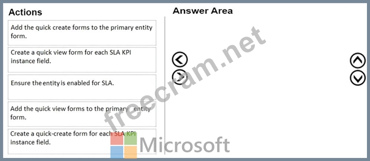 1 - Ensure the entity is enabled for SLA. 2 - Create a quick view form for each SLA KPI instance field. 3 - Add the quick view forms to the primary entity form. References: https://docs.microsoft.com/en-us/dynamics365/customer-engagement/customer-service/add-timer-forms-tracktime-against-enhanced-sla