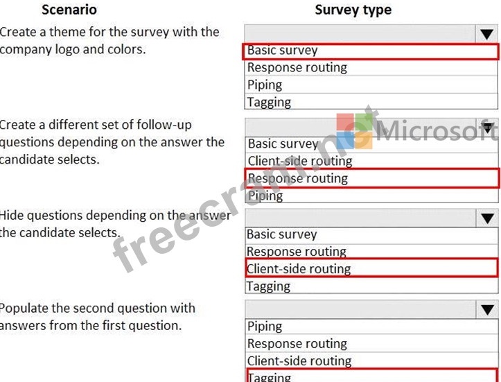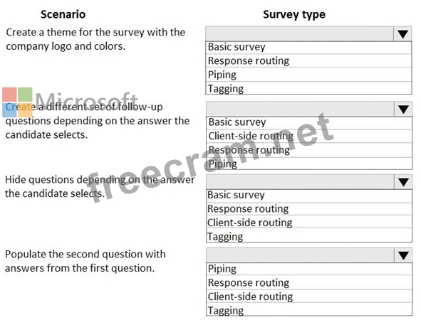 Which survey features should you use? To answer, select the appropriate survey type in the dialog box in the answer area.