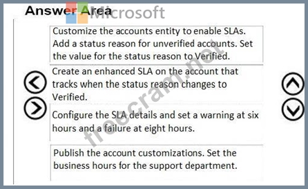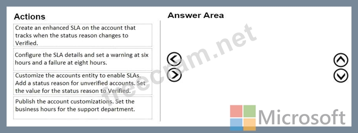 You are a Dynamics 365 for Customer Service administrator. Your company provides support between 9 a.m. and 5 p.m. You must add a warning to account records when service representatives do not contact an account within eight business hours ofthe account being verified. You need to enable service-level agreements (SLAs) for accounts. In which order should you perform the actions? To answer, move all actions from the list to the answer area and arrange them in the correct order.