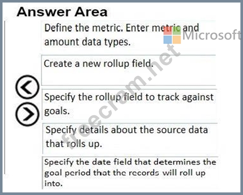 You are a Dynamics 365 system administrator. Your customer service team must define goal metrics to track and measure all resolved cases. You need to create a goal metric with a rollup field. In which order should you perform the actions? Toanswer, move all actions from the list of actions to the answer area and arrange them in the correct order.