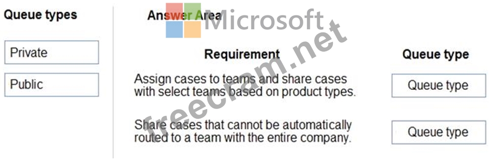 Which types of queues should you use? To answer, drag the appropriate queue types to the correct requirements. Each queue type may be used once, more than once, or not at all. You may need to drag the split bar between panes or scroll to view content.