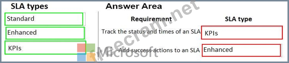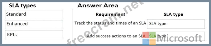 What SLA types should you use? To answer, drag the appropriate SLA types to the correct requirements. Each SLA type may be used once, more than once, or not at all. You may need to drag the split bar between panes or scroll to view content.