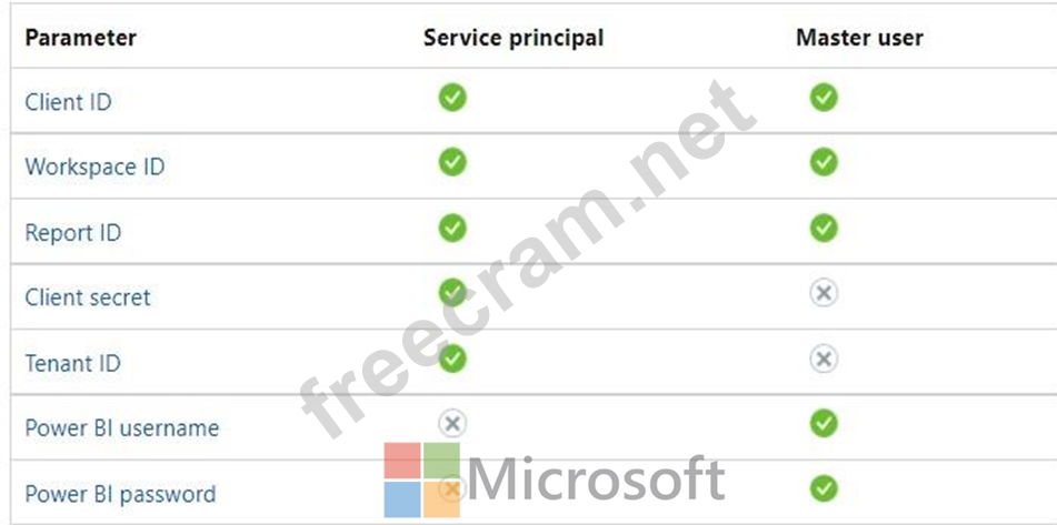 To embed your content, you need to obtain certain parameter values. The table below shows the required values, and indicates if they're applicable to the service principal authentication method, the master user authentication method, or both.