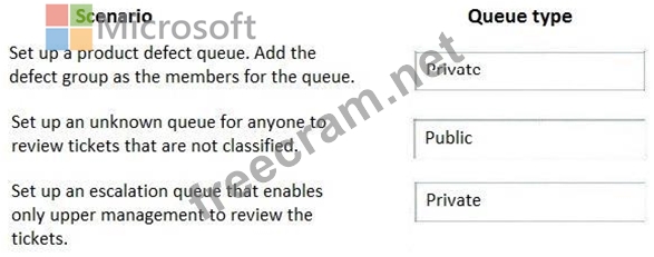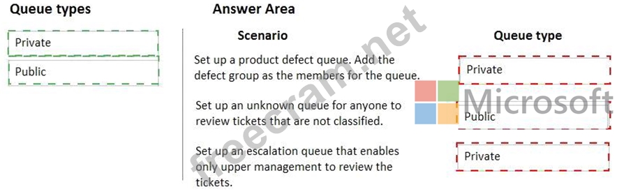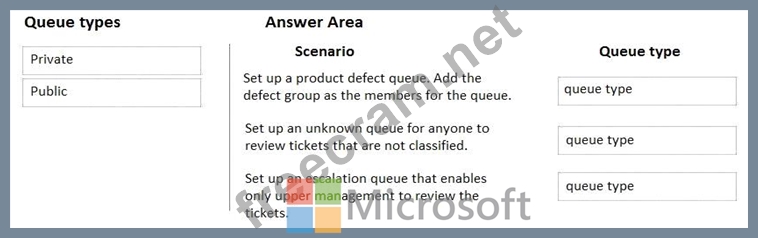 Which queue types should you use? To answer, drag the appropriate queue types to the correct scenarios. Each queue type may be used once, more than once, or not at all. You may need to drag the split bar between panes or scroll to view content.