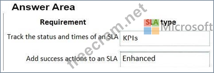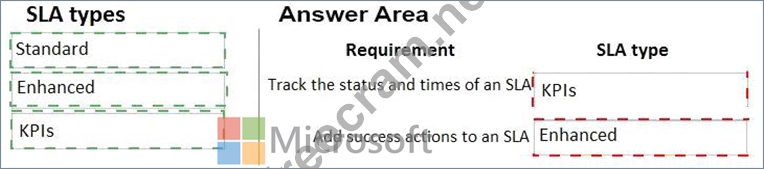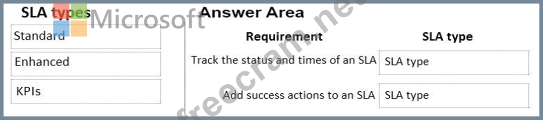 What SLA types should you use? To answer, drag the appropriate SLA types to the correct requirements. Each SLA type may be used once, more than once, or not at all. You may need to drag the split bar between panes or scroll to view content.