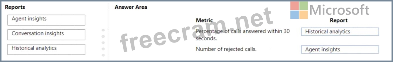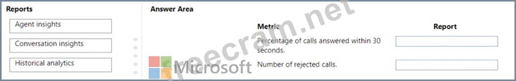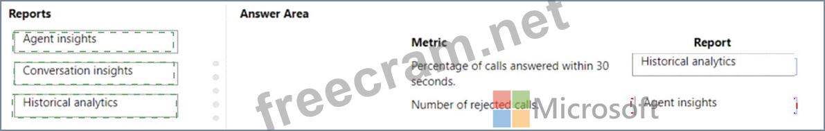 Which reports should you configure? To answer, drag the appropriate reports to the correct metrics. Each report may be used once, more than once, or not at all. You may need to drag the split bar between panes or scroll to view content.