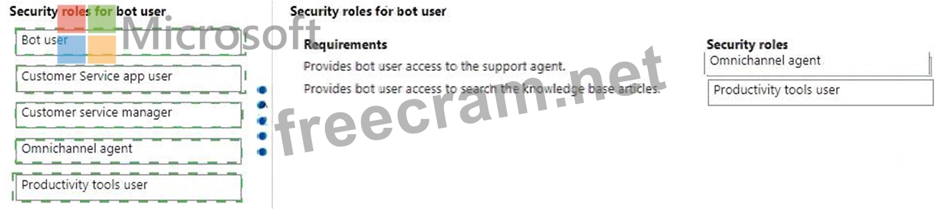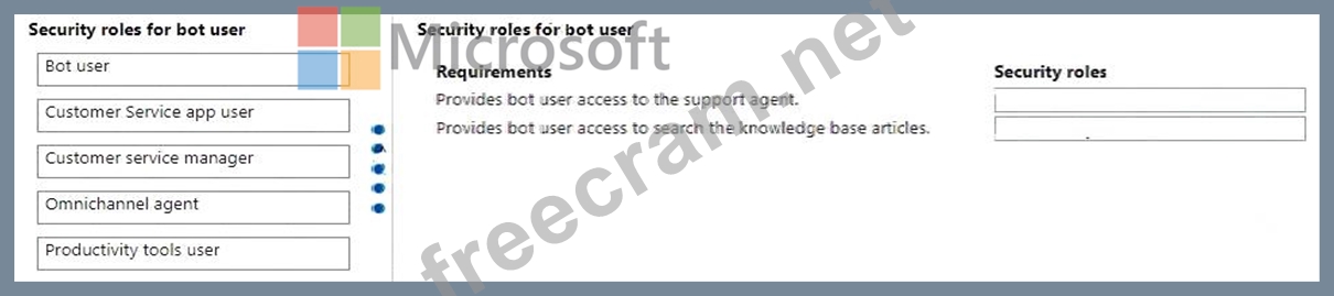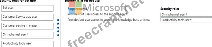What should you identify? To answer, move the appropriate security roles to the correct requirements. You may use each security role once, more than once, or not at all. You may need to move the split bar between panes or scroll to view content.