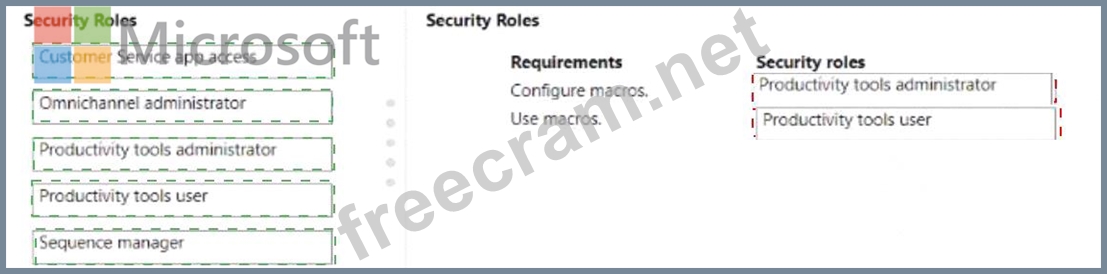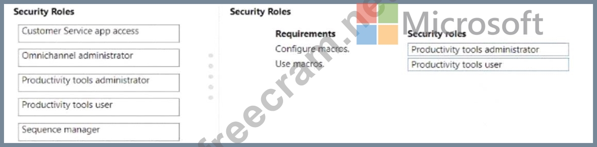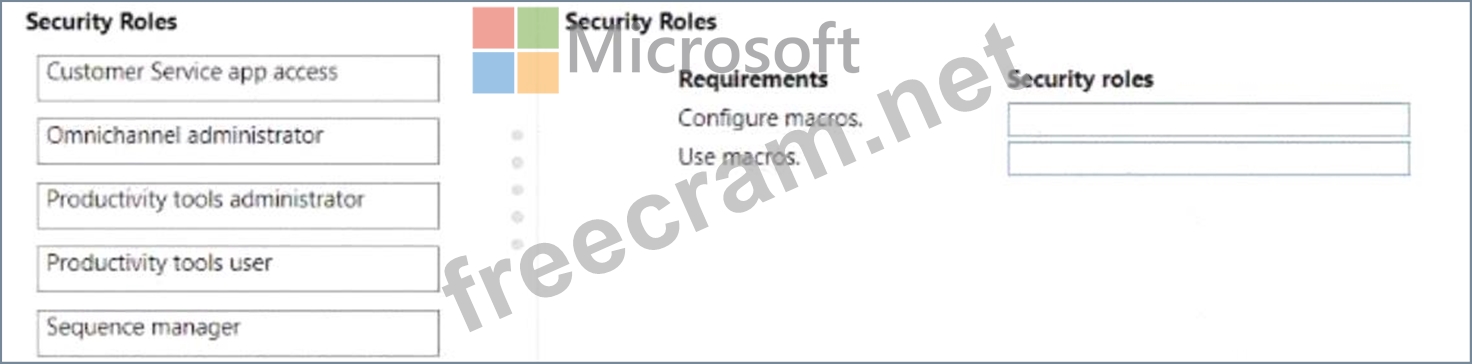 Which security roles are required? To answer, move the appropriate security roles to the correct requirements.
