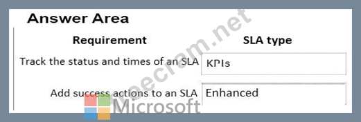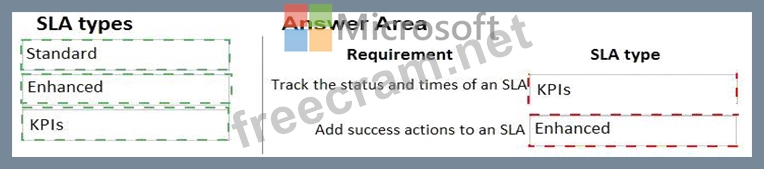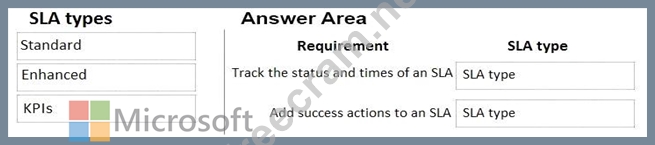 What SLA types should you use? To answer, drag the appropriate SLA types to the correct requirements. Each SLA type may be used once, more than once, or not at all. You may need to drag the split bar between panes or scroll to view content.