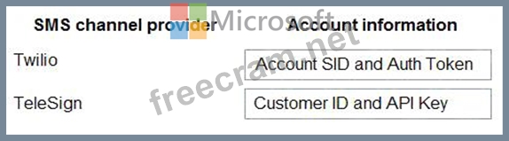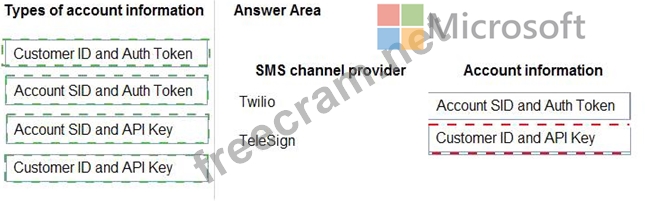 Which account information should you use for each provider? To answer, drag the appropriate types of account information to the correct SMS channel provider. Each type of account information may be used once, more than once, or not at all. You may need to drag the split bar between panes or scroll to view content.