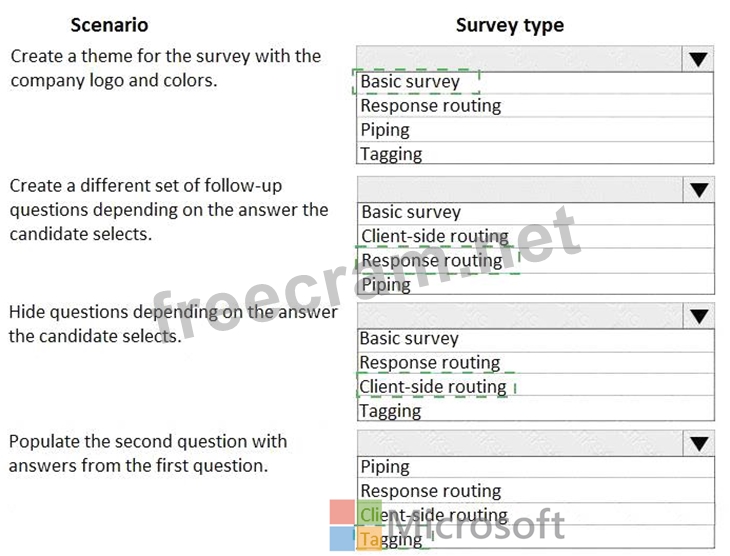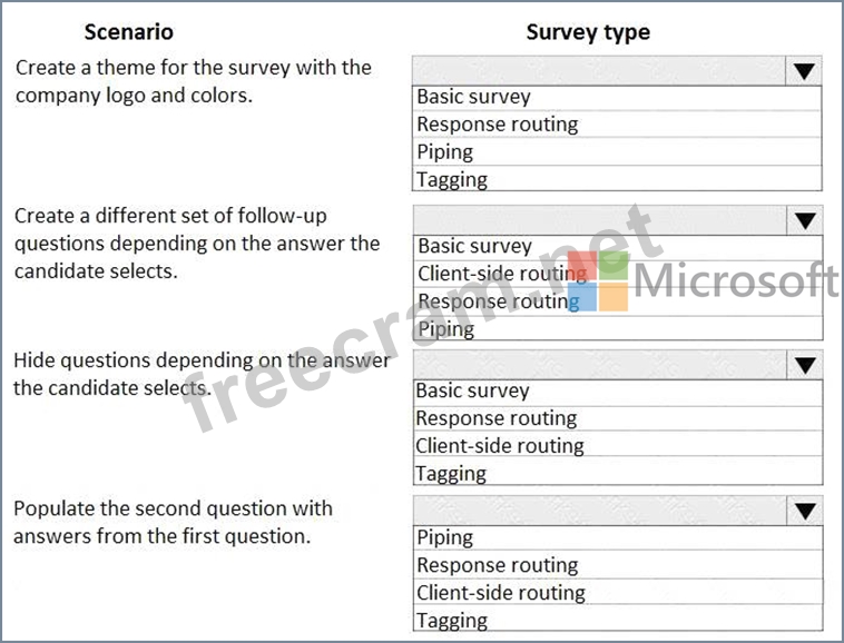 Which survey features should you use? To answer, select the appropriate survey type in the dialog box in the answer area.