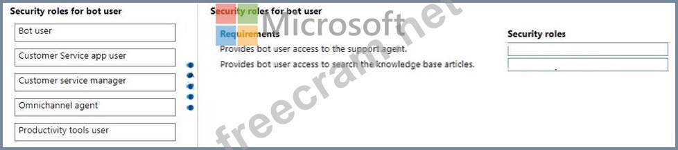 What should you identify? To answer, move the appropriate security roles to the correct requirements. You may use each security role once, more than once, or not at all. You may need to move the split bar between panes or scroll to view content.