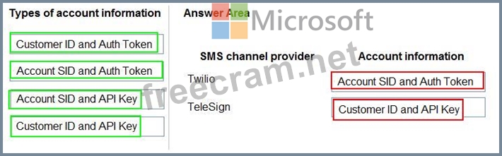 Which account information should you use for each provider? To answer, drag the appropriate types of account information to the correct SMS channel provider. Each type of account information may be used once, more than once, or not at all. You may need to drag the split bar between panes or scroll to view content.