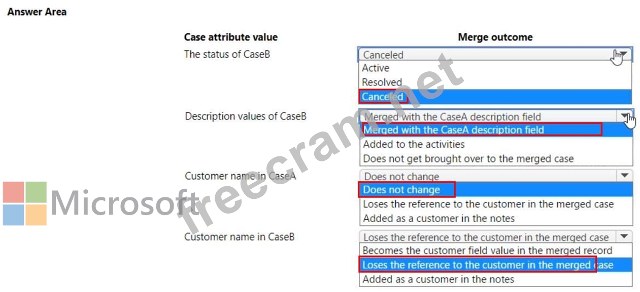 You are the Dynamics 365 administrator for a help desk. You merge CaseB into Case What is the result of the merge? To answer, select the appropriate action in the dialog box in the answer area. NOTE: Each correct selection is worth one point.