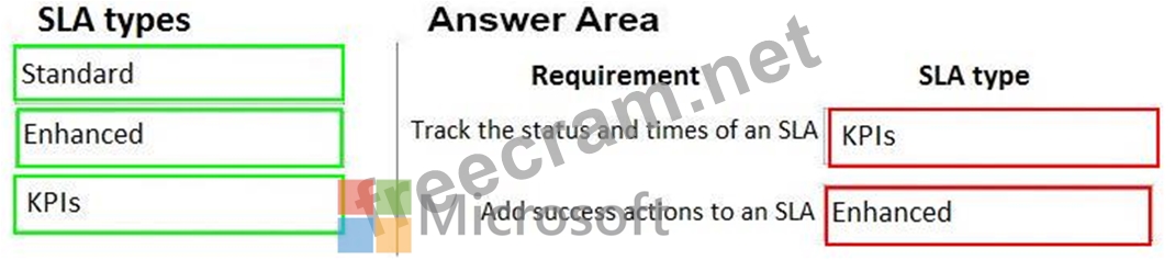 What SLA types should you use? To answer, drag the appropriate SLA types to the correct requirements. Each SLA type may be used once, more than once, or not at all. You may need to drag the split bar between panes or scroll to view content.