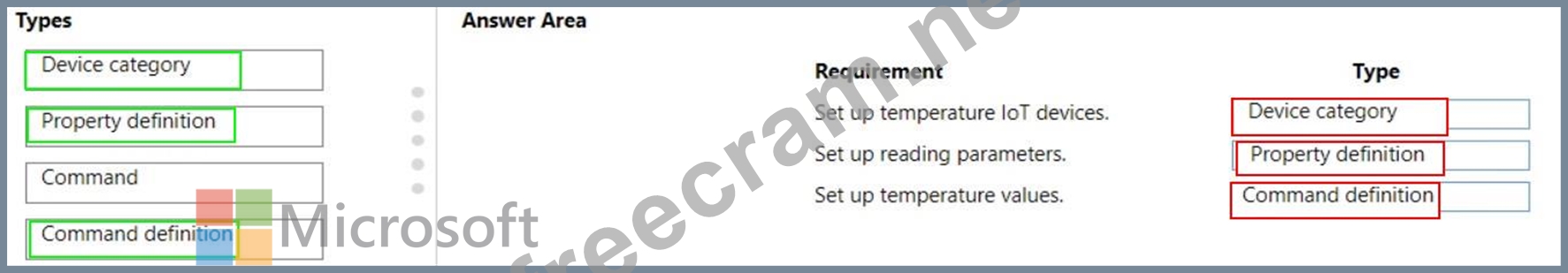 A user is configuring loT devices to record specific types of information, such as temperature, humidity, and air flow. Several types of devices require configuration for pre-set commands and ease of administration.