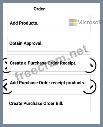 After creating a purchase order, what are the five steps, in sequence, for completing the order and receivingthe products? To answer, move the appropriate actions from the list of actions to the answer area and arrange them in the correct order.