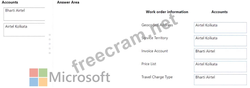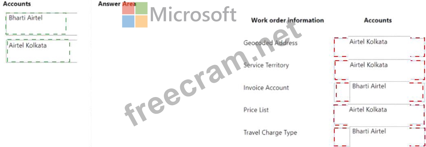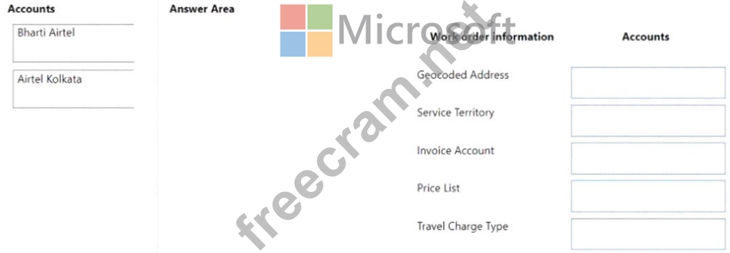 Which account belongs to each piece of work order information? To answer, drag the appropriate account to the correct piece of work order information. Each account may be used once, more than once, or not at all.