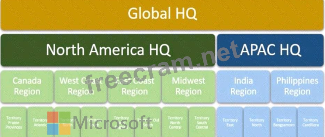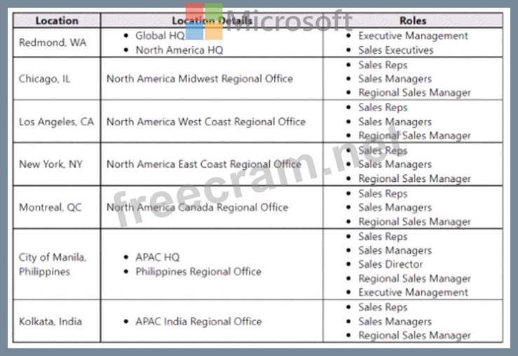 Contoso has main offices in North America. Europe and Asia, with global headquarters based in Redmond, Washington, USA. Each of the regional offices has their own sales and service teams. The regional HQ locations also include sales and services leaders and executive management. Global HQ houses company executives for various departments, including sales and service.