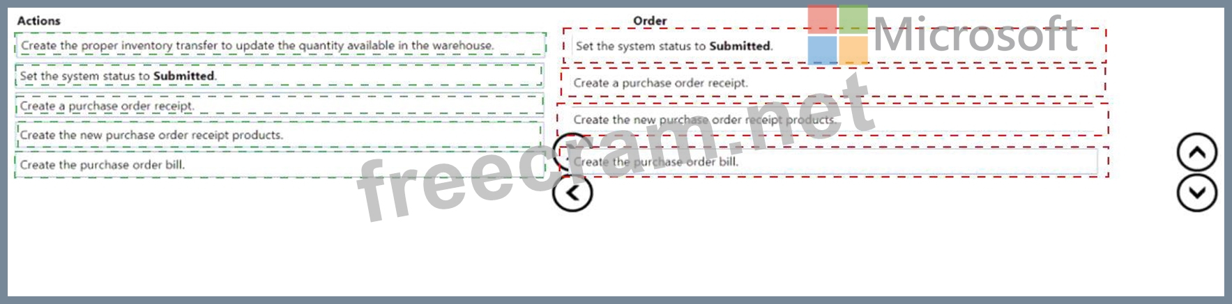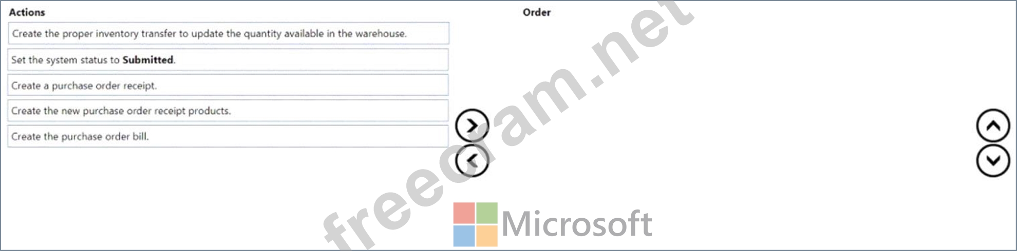 You need to create a purchase order for a thermal overload cooling fan for the refrigeration unit on the shop floor. You create a purchase order and add products. Which four actions should you perform in sequence to complete the order and receive the products? To answer, move the appropriate actions from the list of actions to the answer area and arrange them in the correct order.