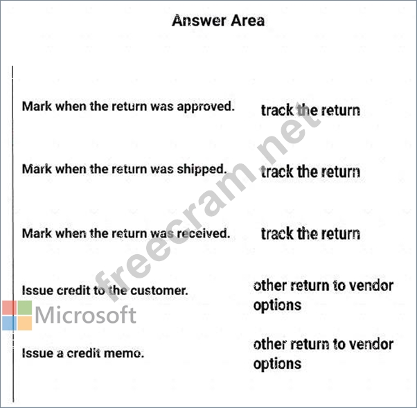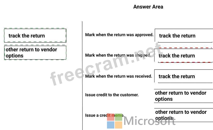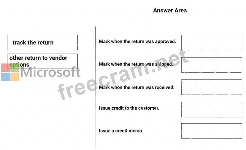 Which actions correspond with track the return and which actions correspond with another return to vendor option? To answer, drag the type of return to the action. Each type or return may be used once, more than once, or not at all. You may need to drag the split bar between panes or scroll to view the content.