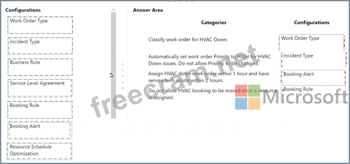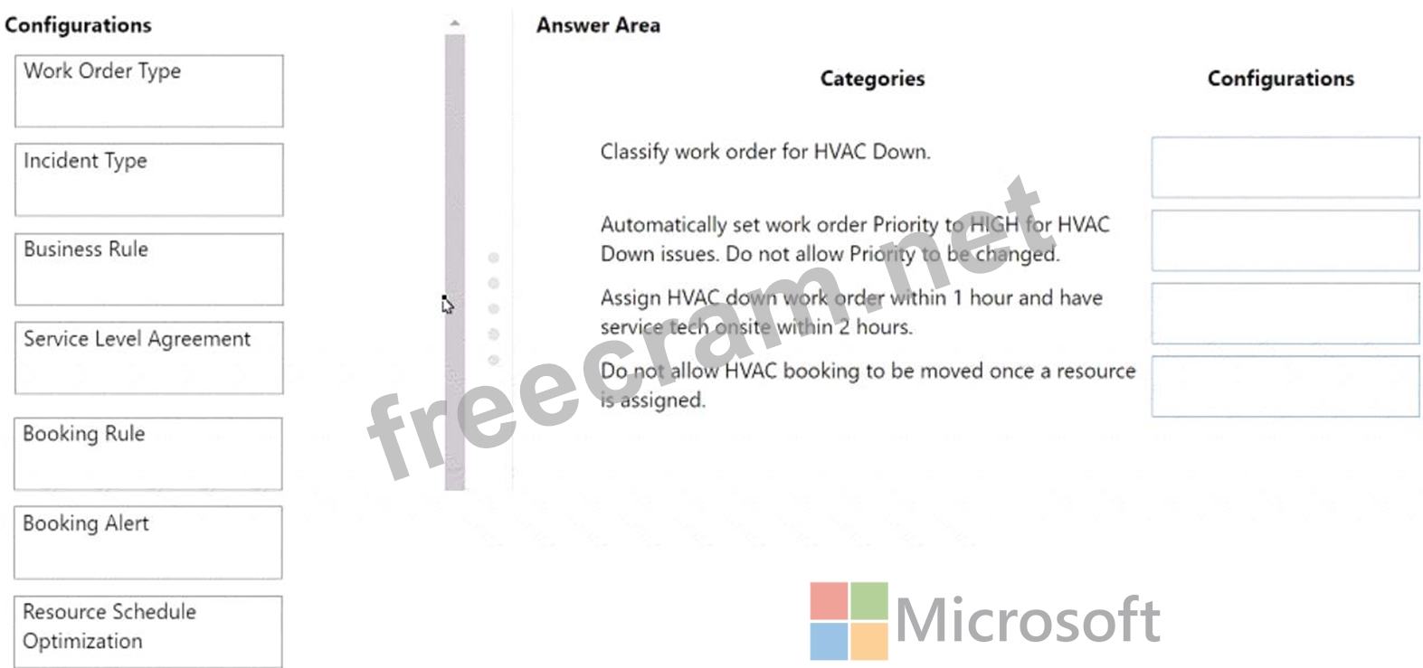Which configuration steps should you take in each of the categories listed? To answer, drag the appropriate configuration to the correct category in the answer area. Each element may be used once, more than once, or not at all. You may need to drag the split bar between panes or scroll to view content.