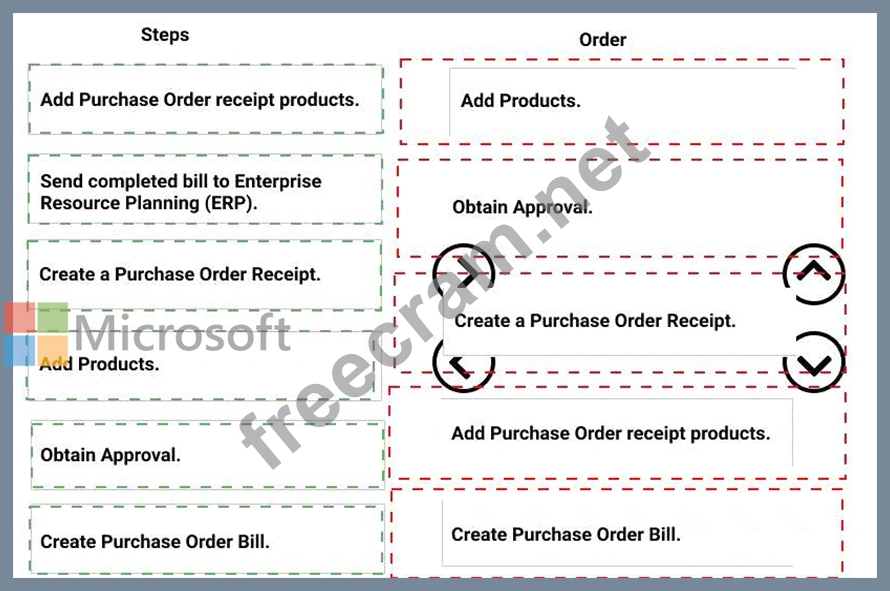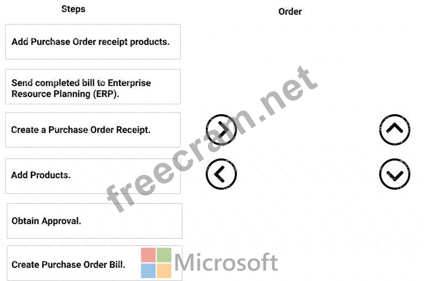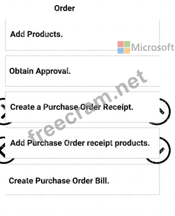 After creating a purchase order, what are the five steps, in sequence, for completing the order and receivingthe products? To answer, move the appropriate actions from the list of actions to the answer area and arrange them in the correct order.