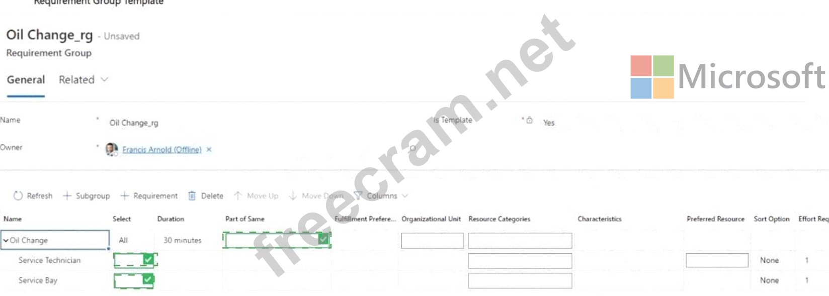 You need to set up a universal Requirement Group Template for scheduling oil changes that will require both a service technician and a bay in the shop.