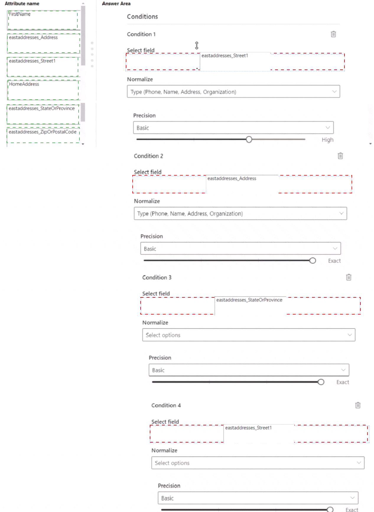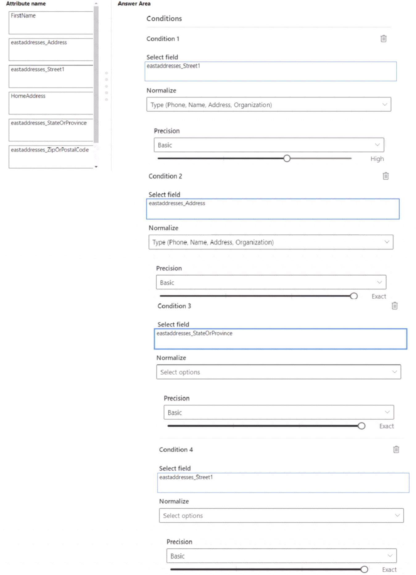 Your manager asks you to delete all custom deduplications rules and create new ones for each regional data source. Customer records are considered duplicates if they contain: