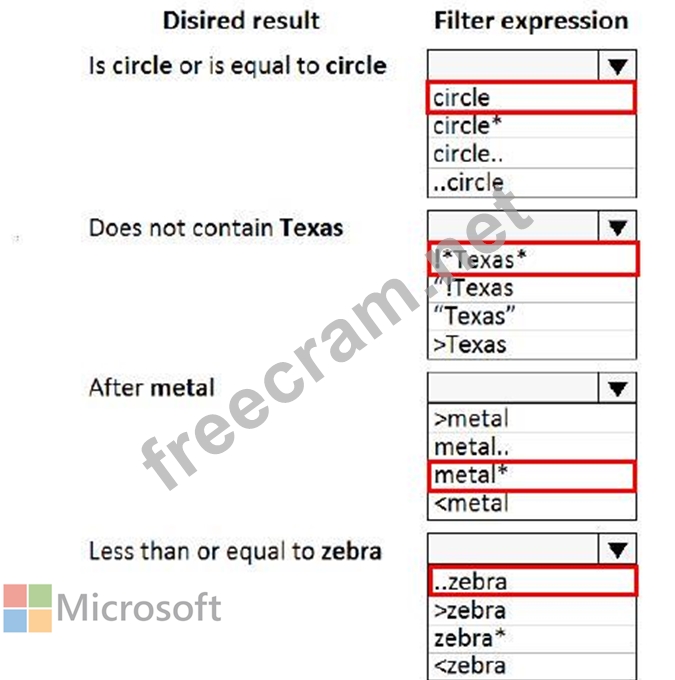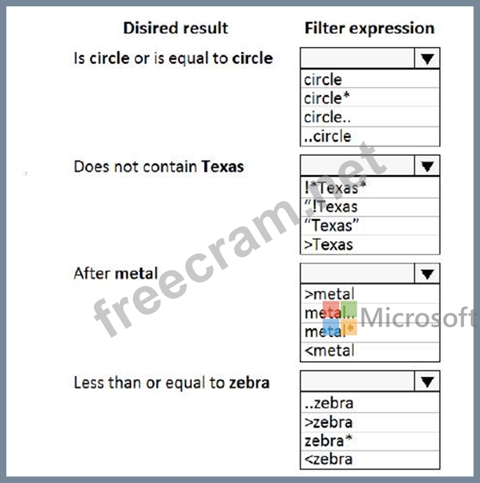 Which filter expressions should you use? To answer, select the appropriate options in the answer area.