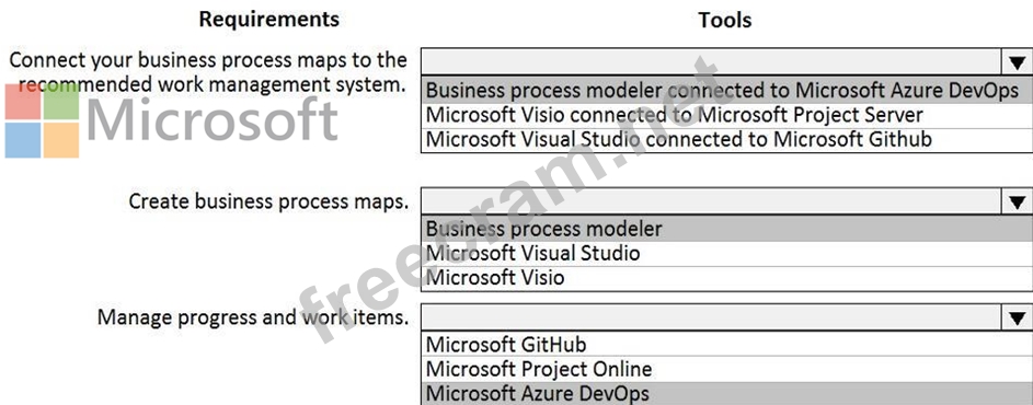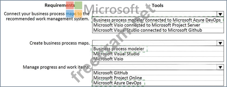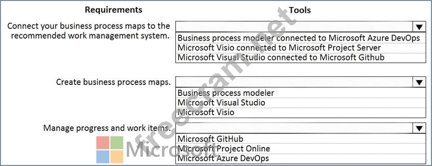 You review business processes and their associated requirements. These work items include bugs, tasks backlog items, tests, and documents You need to perform the following tasks: